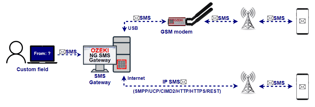 The diagram illustrates the use of custom fields in Ozeki NG SMS Gateway. A user inputs a message with a custom sender ID into the SMS Gateway, which then routes the message through either a GSM modem via USB or over the Internet using various protocols (SMPP, UCP, CIMD2, HTTP, HTTPS, REST) to reach the recipient's mobile phone. This system allows for enhanced personalization and flexibility in messaging, catering to diverse sender requirements and communication needs.